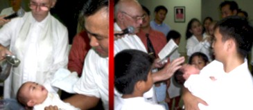 Binzler officiating the First Friday Mass. The two baby boys baptized on